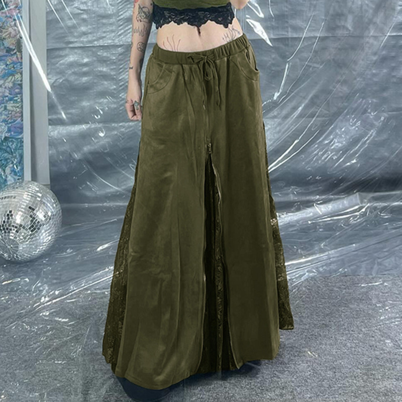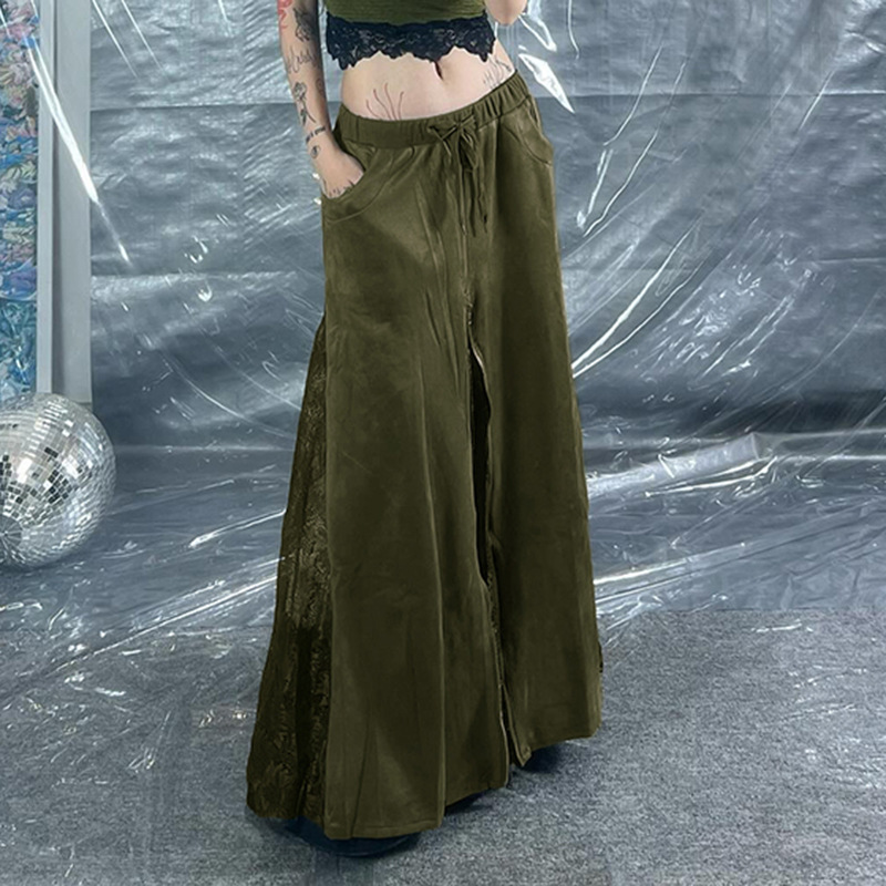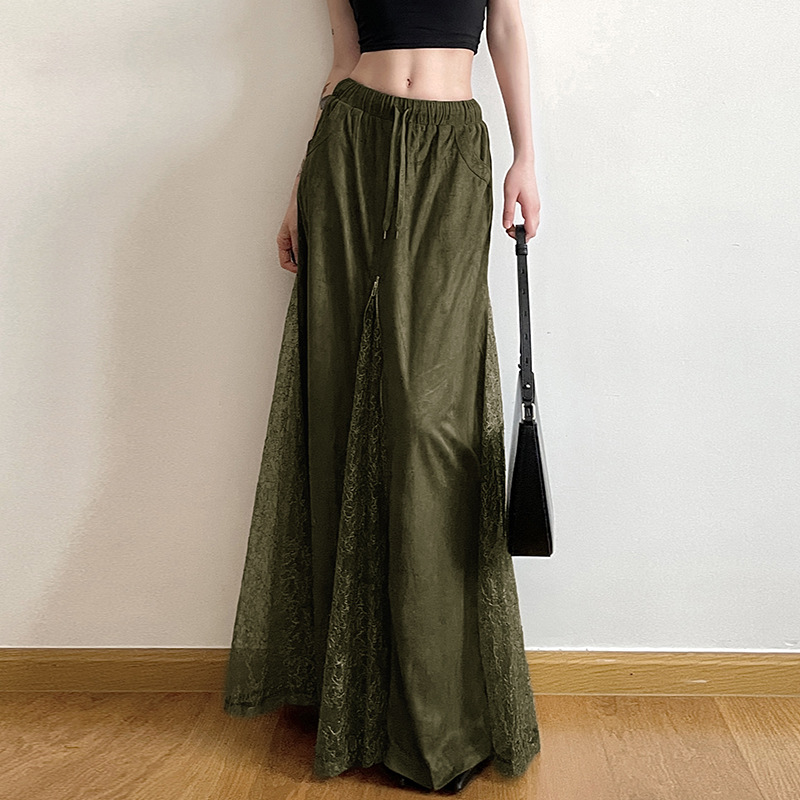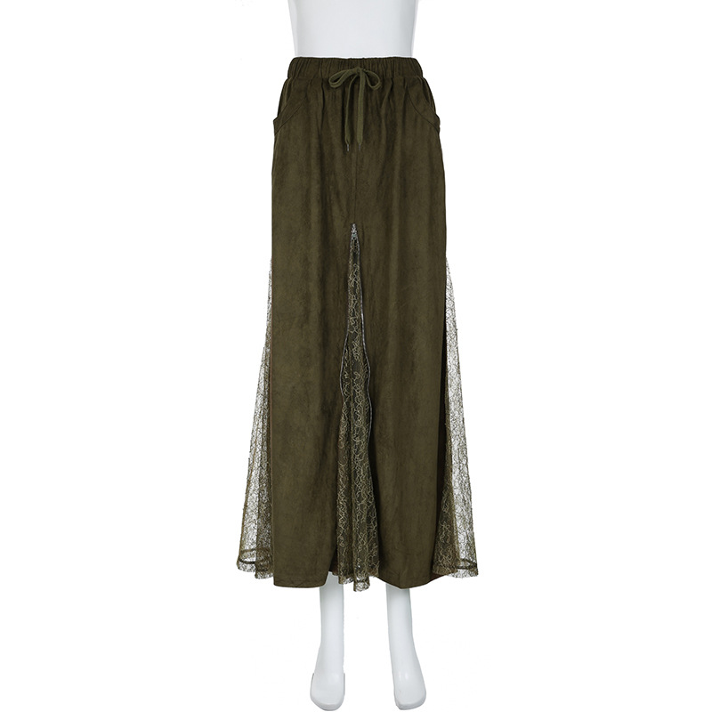 Vintage Green Lace Splicing Low Waist A-line Floor-length Skirt with Heavy Zipper